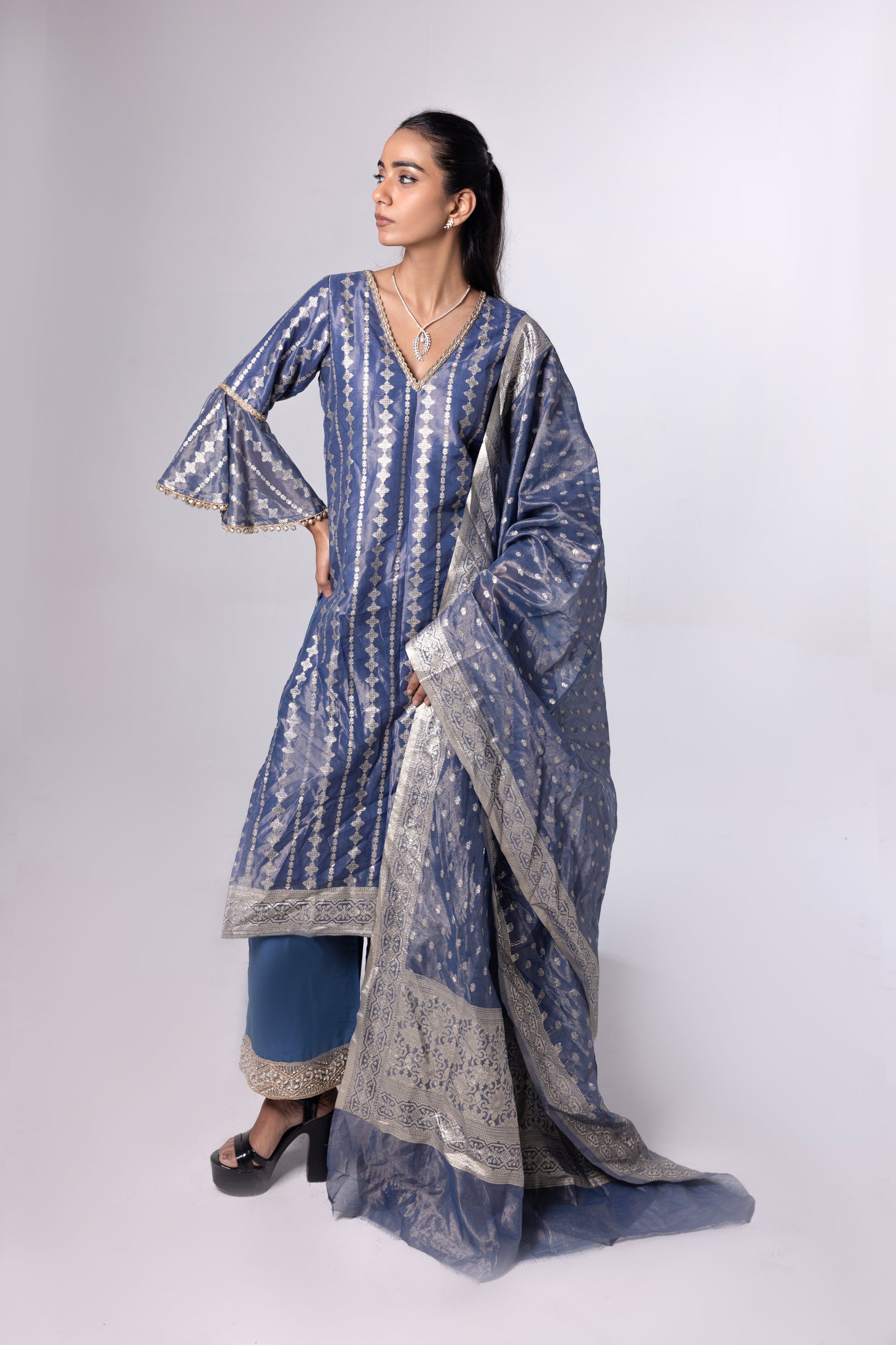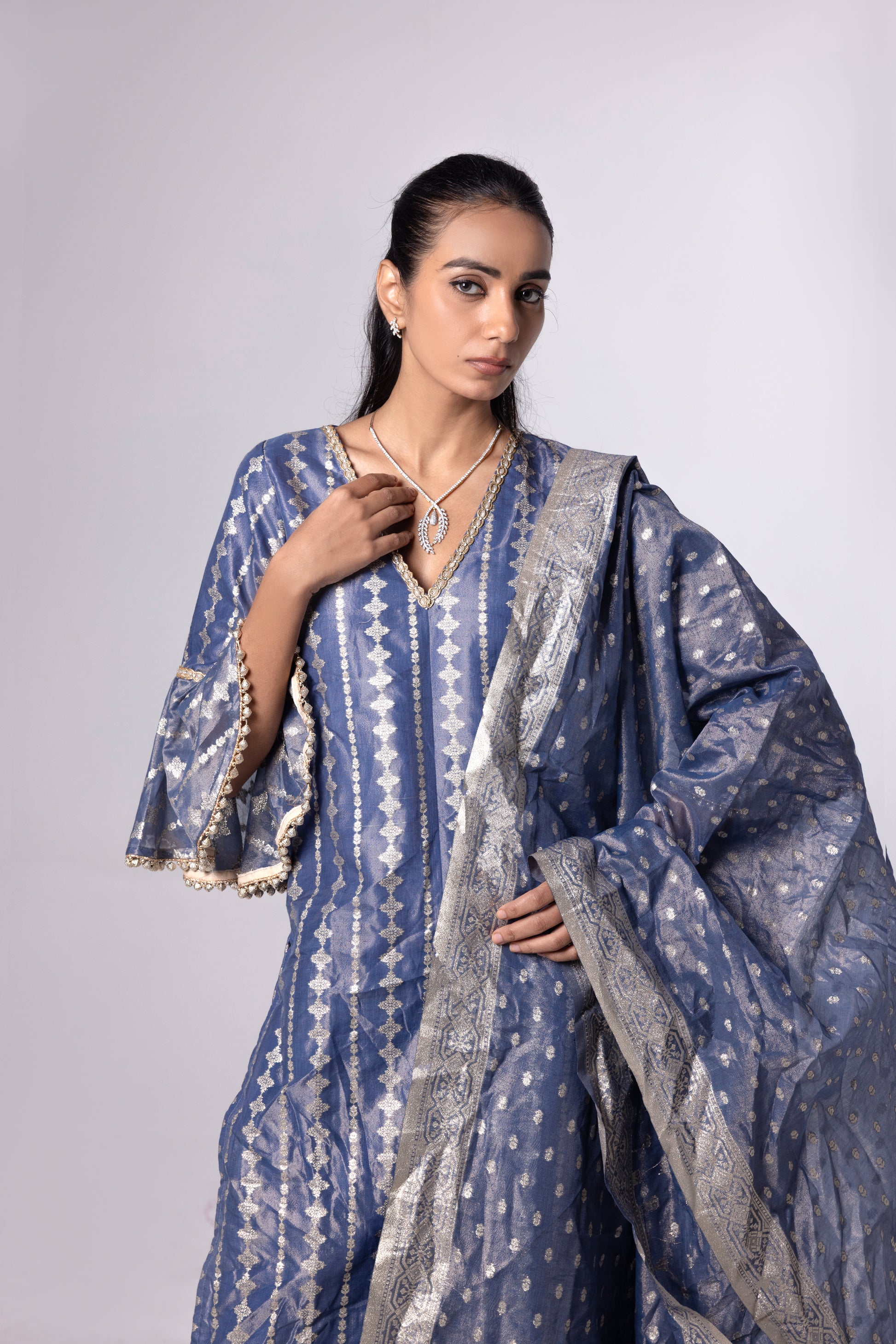 A bottle green tissue kurta set featuring intricate floral detailing and a structured geometric pan-shaped V-neck, enhanced with refined viscose lace accents. Finished with a statement dupatta showcasing bold patch butas and detailed jali borders for a premium, elevated look.